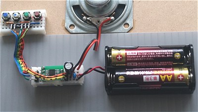 部品としては、電池、電池ケース、IC、抵抗(2本)、コンデンサ、とスピーカーおよびマイクロスイッチです。