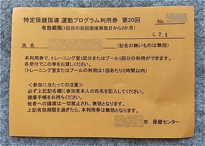 健康相談では、数値を良くするためのアドバイスと、市民総合体育館でのトレーニング室の回数券 (20回分)なるものをいただきました。これは3ヶ月間の期間限定ですが 使用料300円(市民の場合)がなんと無料になるというものです。