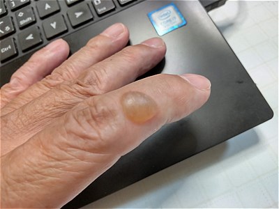 アチッ! ということで昨日火傷をしてしまいました。すぐに流水で冷やしたのですが手遅れだったようで、 今日になったらこんな感じで膨らんでいました。